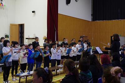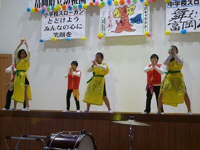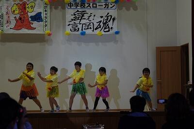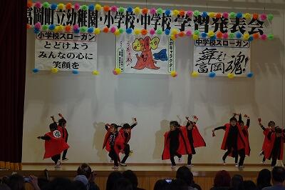 給食の後は、体育館で4校の交流会。富岡第一・第二小は、「よさこい」を披露しました。