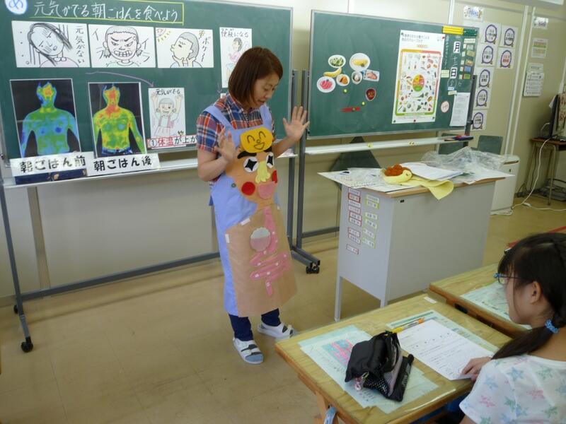 担任と栄養士と連携して授業を進めます。 いたた!よくかまないと、お腹が痛くなるよ。