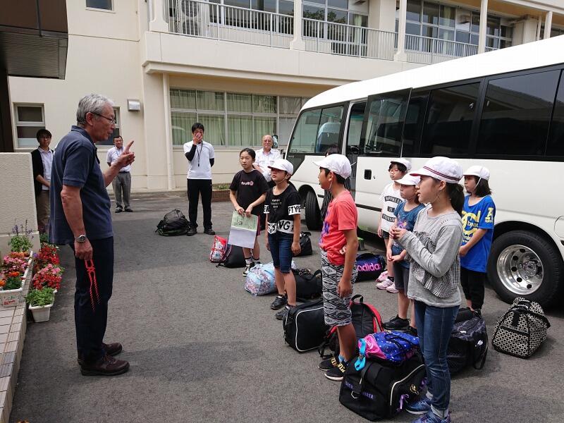 2、3年生、幼稚園のみなさん、 中学校の先生方の見送りを受けて、出発しました。