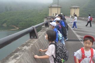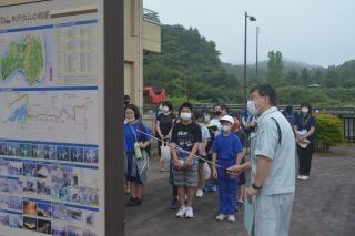 場所を借りて着替えをしたら、木戸ダムについて簡単に解説していただき、少し見学しました。巨大なダムに子ども達はとても驚いていました。