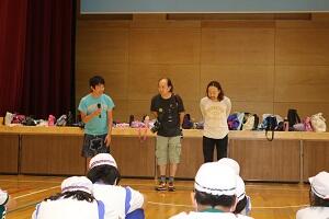 昨年までJリーグで活躍していた西嶋弘之さんとDREAM福島アクションプランの上條仁志さんが来校し、小学校校長、教頭、中学校教頭と一緒に授業を行いました。
