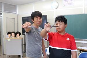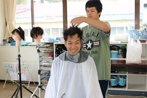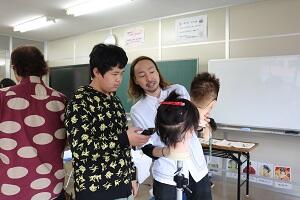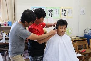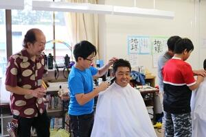 理容師の職業体験をしました。長峰さんたちの本職は理容師・美容師なのです。