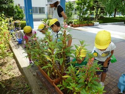 学校では、みんなが育てているアサガオやヒマワリ、ホウセンカ、ヘチマ、そしてメダカたちが、みんなの登校を楽しみに待っています。