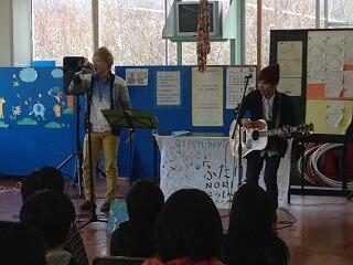 「ふたり」の願いは、音楽により、日本中、そして世界中の誰もが笑顔で元気になっていくことです。みんなの心の応援団「ふたり」、パワフルで鮮明なボーカルの石崎さん、高く甘く包み込むようなボーカルの小沼さん、「ふたり」の違うタイプのボーカルから繰り出され、交わるハーモニーは、私たちの心に響いてくるものでした。年間に100本以上のライブを中心に精力的に活動中の「ふたり」の歌声に、子どもたちも感動していました。