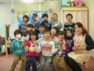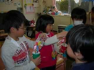 年中さんと年小さんが心をこめて作ったお花を年長さんに、年長さん手作りの紙粘土マグネットを年中さんと年小さん、先生たちにプレゼントしてくれました。