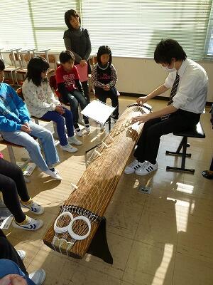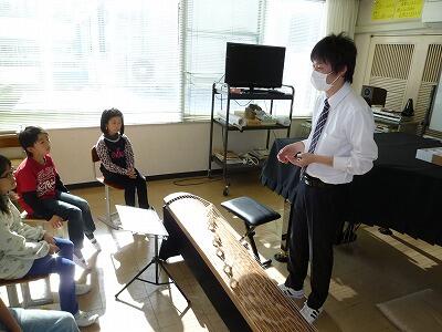 最後に、渡部先生の演奏を聴かせていただきました。「まりつき」「汽車ごっこ」の2曲でした。どちらも情景が目に浮かぶような演奏で、子どもたちからは「ぼくもこんな風に箏が弾けるようになりたい。」「中学校に入ってまた箏の勉強をするのが楽しみ。」という感想も聞かれました。中学校と同じ校舎で学習している本校ならではの、貴重な体験をすることができました。中学校の渡部先生、ありがとうございました。