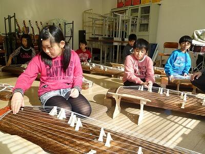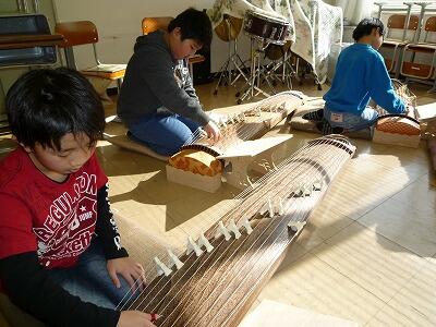 今度は音色をきいてみます。一人ずつ楽器の前に正座し弦をはじくと、とてもいい音が響きました。この後、「さくらさくら」の弾き方を教わり、みんなで合わせて演奏できるほどに上達しました。