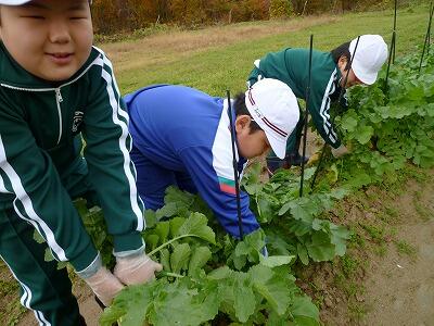 曙ブレーキの佐久間さんの畑に3年生が社会科見学へ行きました。大根や白菜を収穫しましたが、初めての経験で力の入れ方、大根の抜き方などを教えてもらい、泥だらけになりながら一生懸命収穫することができました。その後は佐久間さんに畑仕事について質問し、野菜の育て方の工夫や土の中には何を入れているのかなどをご指導いただきました。