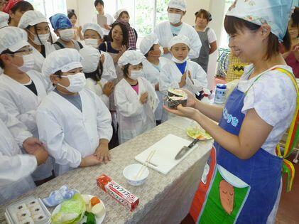 【家庭教育学級】 野菜の大切さについて学んだ後、野菜たっぷり「おにぎらず」を親子で作りました。
