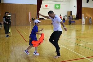 最初に、鬼ごっこやドッヂビーで一緒に楽しみました。素敵な笑顔で