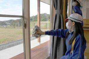 利用者の方々との交流はできませんでしたが、中学生のみなさんと協力して、窓ふきや蜘蛛の巣取りなどを