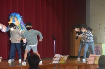 高学年「とみっぴーと校歌めぐりの旅」一小二小の校歌について調べたことを劇で紹介