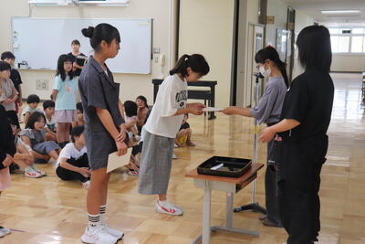 校長先生のお話の後、6年生の進行で、「七夕のお話」「七夕クイズ」を行い、各学年の代表が願い事の発表をしました。