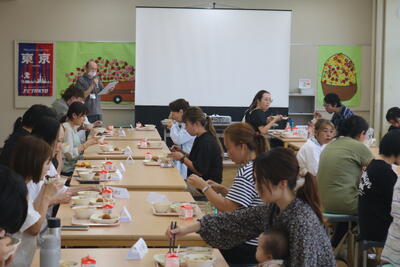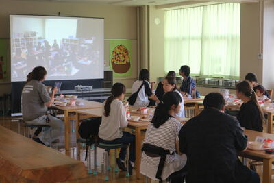学校での給食の様子や、わくわく弁当デーの様子の写真のスライドなどを見ながら、試食しました。