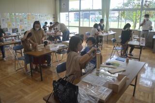 高学年は、木製の筆箱を作りました。たくさんの細かい部品や似たような部品があり、間違えないように気を付けながら作成していました。組み合わせの順番や紐遠しなど、難しい内容でしたが、親子で協力し合っていたと思います。