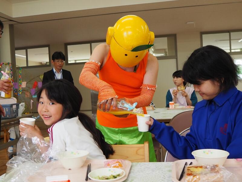 三春校を訪問してくれた愛媛県のみかんジャーが富岡校にもきてくれました。
