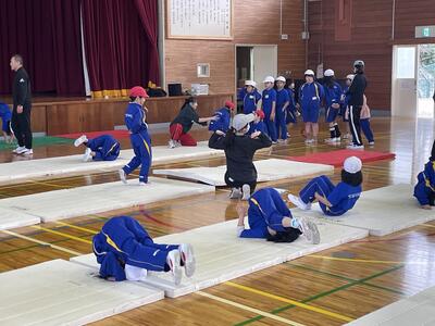 (中高学年:前転、後転、開脚前転、開脚後転、側方倒立回転、壁倒立など)