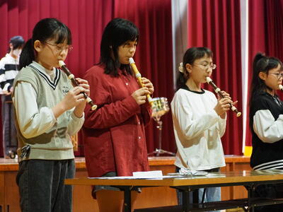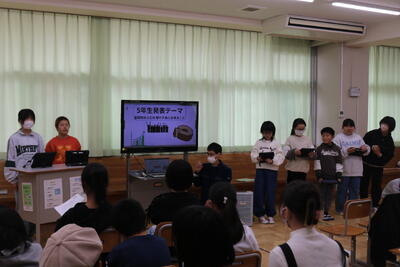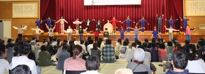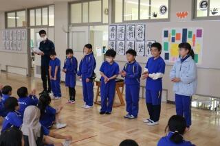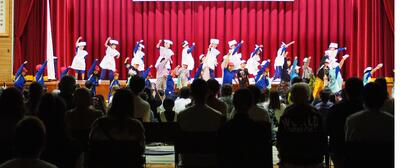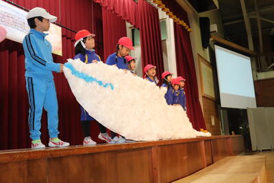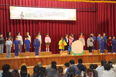 小学校の発表では1・2年生が「くじらぐも」の劇、3・4年生が「桃太郎」の英語劇、5・6年生が「学園天国」の合奏をしました。それぞれの学年で、息の合ったダンスも披露しました。