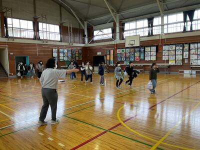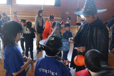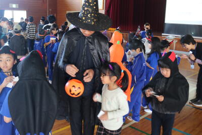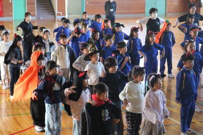 それぞれがちょっとした仮装をして体育館に集まった全校生で、ダンスをしたり、英語のゲームをしたりして英語とハロウィンの文化に慣れ親しみました。