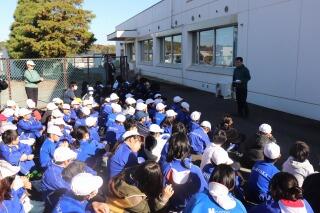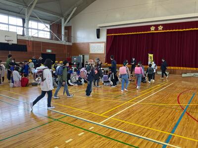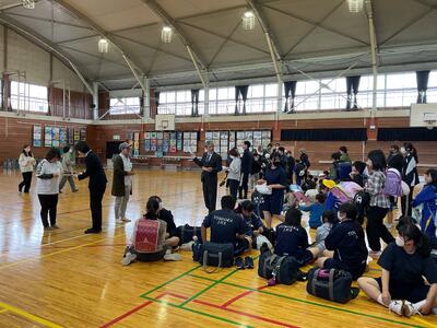 子どもたちは、教室で地震発生(訓練)の知らせを受け、先生の指示に従って体育館へ避難しました。