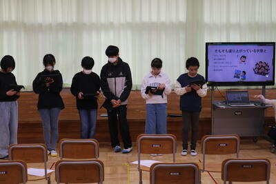 29日(土)にふたば未来学園で行われる「ふるさと創造学サミット」に参加する5,6年生が多目的ホールでリハーサルを行いました。