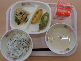 わかめごはん 牛乳 豆乳の味噌汁 三色和え 笹かまぼこの二色揚げ