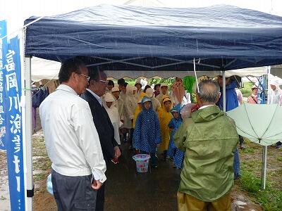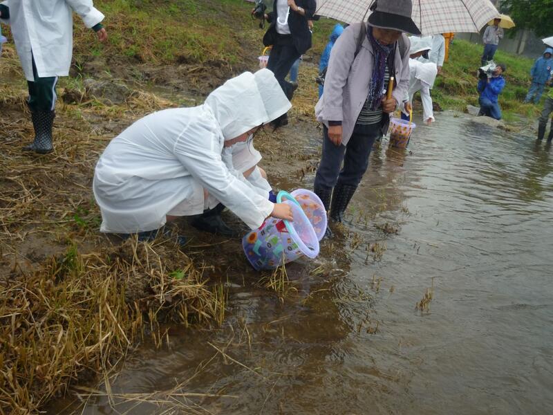 本日あいにくの雨の中、11時から富岡川の河川敷で「富岡町漁業協同組合様」の主催でアユの放流を実施しました。