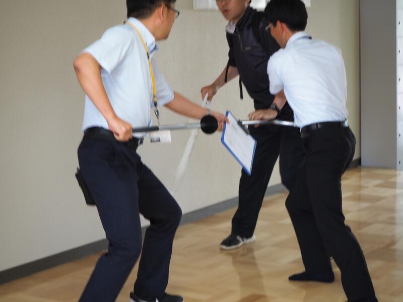 不審者の対応訓練をする教職員の様子↓