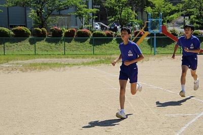 今日の全校体育は、「体つくり運動②」です。ボールを使った運動やなわとびを使った運動を行いました。体をうまく使わないとできないものには、少し手こずっていたようですが、全員達成することができました。なわとびでは、3分間で前跳びを450回跳んだ生徒もいました。前回よりも全員が良い記録になっています。