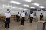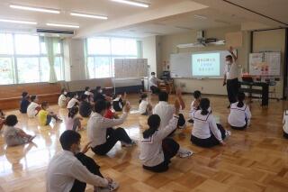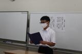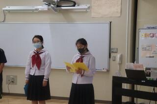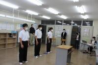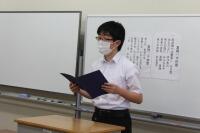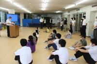 代表生徒による学期の反省では、学習面で課題をためないこと、生活面で運動することや早寝早起き、バランスの良い食事などについて発表がありました。また、生徒指導担当教師から、夏休みの生活について、学習、部活動、メディアの利用、感染症対策などについて、注意点を聞きました。