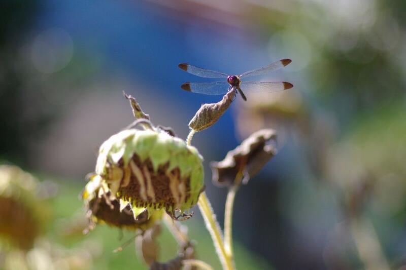 三春校の花壇のヒマワリでトンボが休憩中。種はまた来年植えられます。
