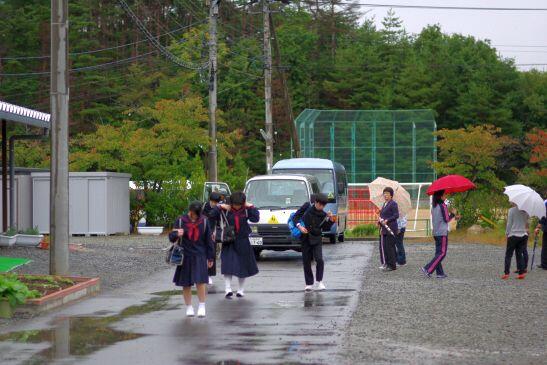 気温18度と半袖では肌寒い感じ。子どもたちは元気に登校してきました。