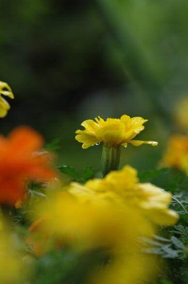 洗い流されてきれいになった水たまりにマリーゴールド、サルビアが映えている。