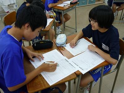 英語科の授業に参観し、生徒たちが英語で自己紹介をした後、二名の教員がグループごとに生徒と交流をしました。