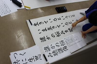 写真は、「解」の練習をしている場面です。すでに清書となっていますが、納得する字を書くために半紙に何度も書いて練習していました。