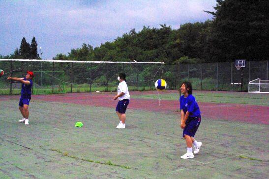屋外での体育はバレーボール、水分補給が欠かせません。