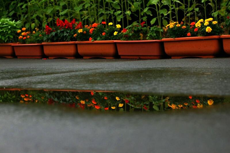 洗い流されてきれいになった水たまりにマリーゴールド、サルビアが映えている。