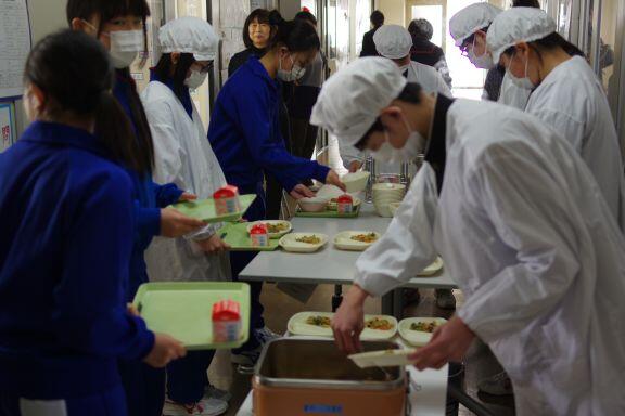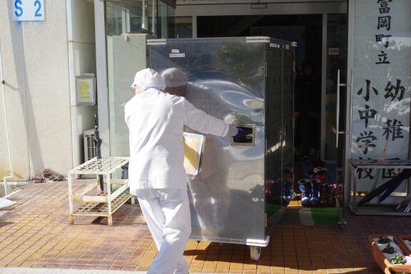 給食は田村市給食センターから大きなコンテナに載せられて運ばれてきます。