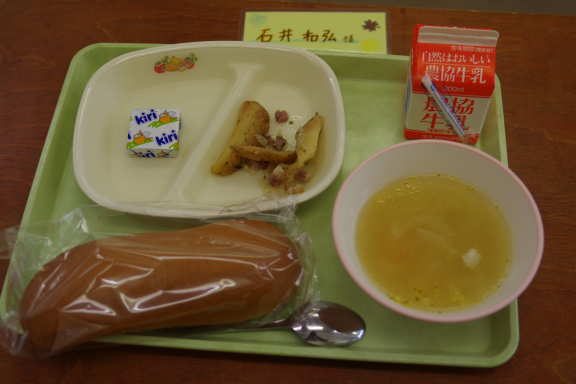 ジャーマンポテトにコーンスープ、kiriのクリームチーズがついてました。