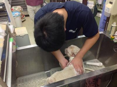 洗っている犬は気持ちよさそうでした。洗うほうは汗だくです。
