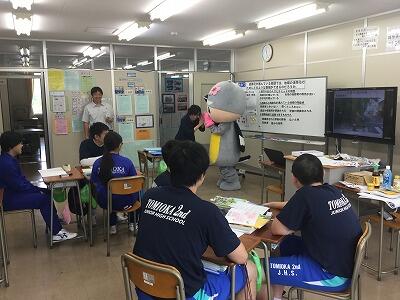 過疎化が進む地域の活性化のためにどうするか考えました。富岡の取組の例として、とみっぴーが登場しました。