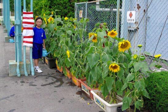 プランターのヒマワリはどうかな? こっ、これはえらいこっちゃ!