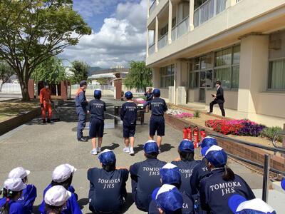 地震の後、火災が発生したことを想定し、避難を行い、その後、富岡消防署の方々の指導の下、消火器の使い方について学びました。みんな真剣に取り組んでいました。