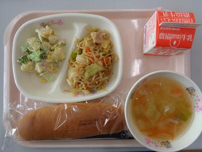 コッペパン 牛乳 焼きそば ブロッコリーサラダ ABCスープ