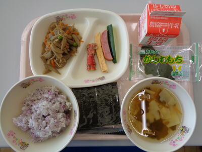 ゆかりごはん 牛乳 手巻き寿司 ごぼうの生姜煮 若竹汁 柏餅