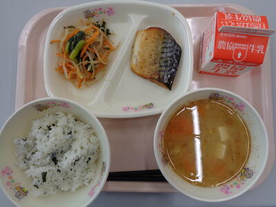 わかめごはん 牛乳 さばサラサ焼き 三色和え どさんこ汁