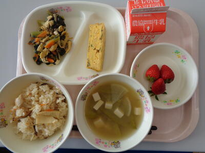 たけのこごはん 牛乳 五目厚焼き玉子 小松菜と油揚げの煮浸し きぬさやのみそ汁 いちご