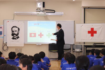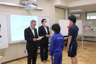 青少年赤十字加盟登録式が行われました。登録証とバッチの交付を受け、全員で誓いの言葉を述べた後、賛助奉仕団の方から赤十字についてのご講話をいただきました。