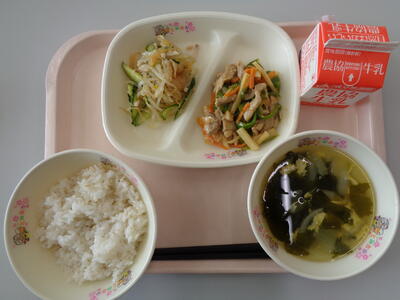 ごはん 牛乳 チンジャオロース 中華くらげ和え わかめと卵の中華スープ