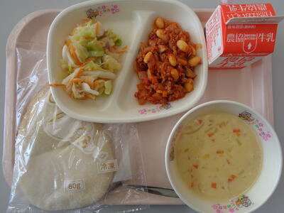 ピタパン 牛乳 チリコンカン キャベツとツナのサラダ 豆乳コーンスープ